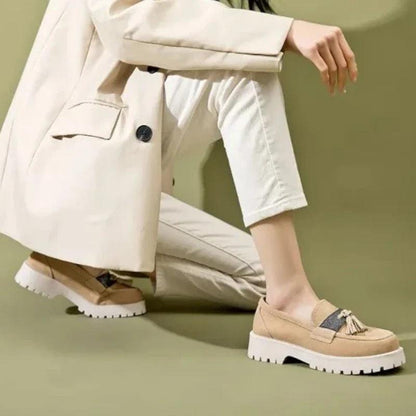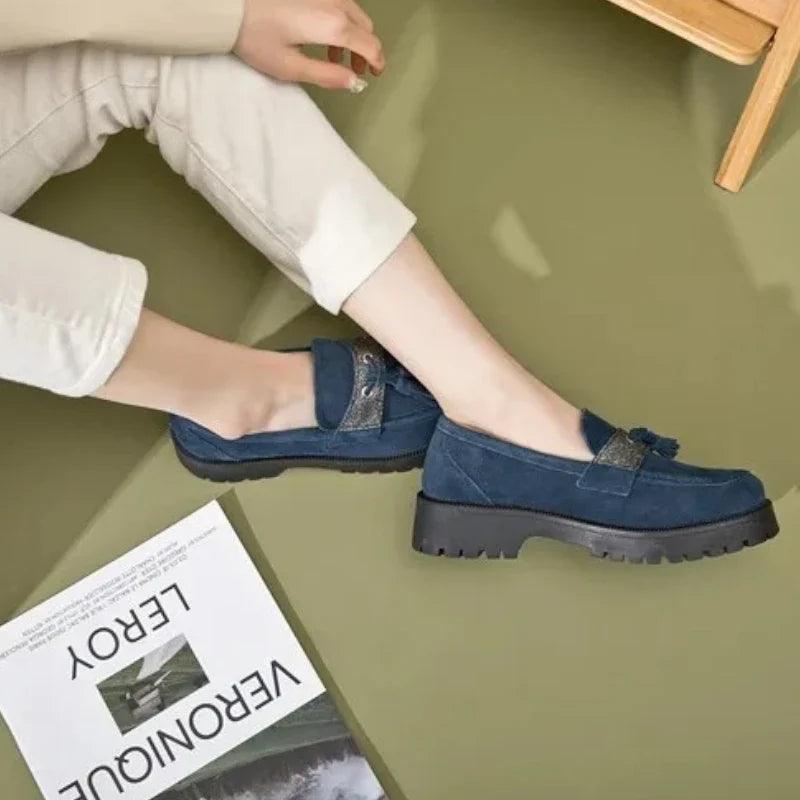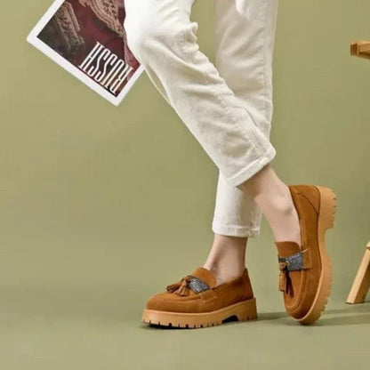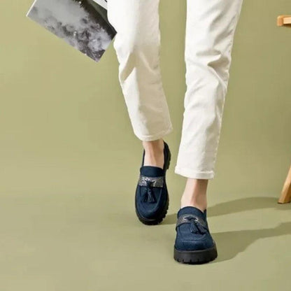 Élevez votre style avec nos Mocassins Orthopédique femmes en daim à talons. Conçus pour allier élégance et confort, ces mocassins sont dotés de semelles compensées crantées, garantissant une démarche sûre et agréable. Les charmants pompons ajoutent une touche ludique et sophistiquée, vous permettant d'afficher votre personnalité avec classe.