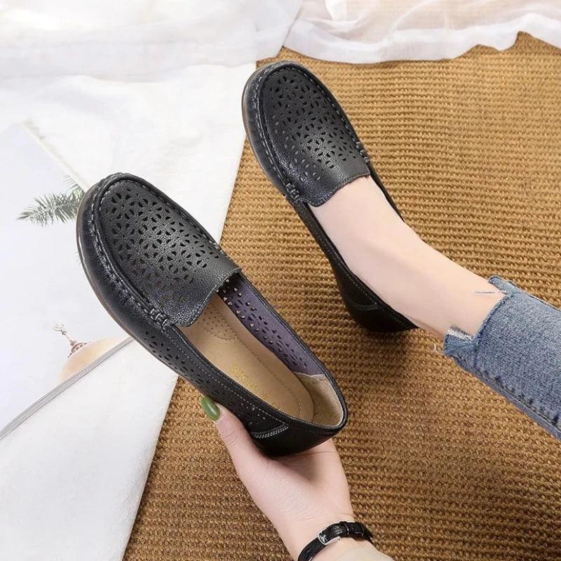 Immergiti nel comfort assoluto con i nostri mocassini ortopedici da donna con suola morbida. Il loro design traforato permette ai tuoi piedi di respirare liberamente, garantendo una sensazione di freschezza, anche quando fa caldo. Apprezzerai la loro leggerezza per tutta la giornata, trasformando ogni passo in un momento di benessere.
