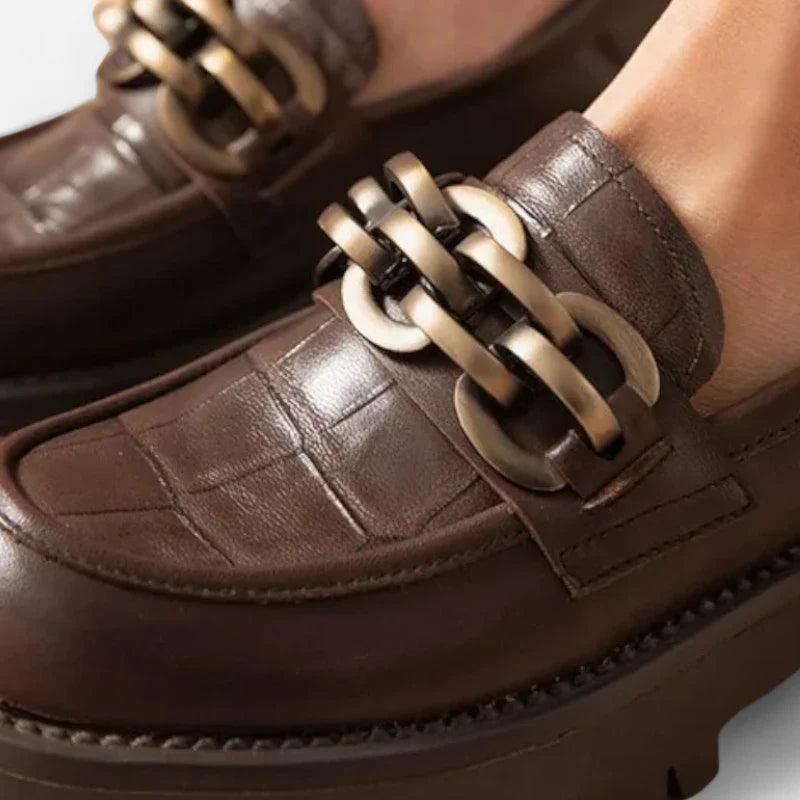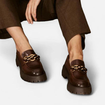 Contraddistinti dai Mocassini Ortopedici da donna con punta tonda in vera pelle, questi mocassini con zeppa incarnano una raffinatezza assoluta. Il loro design sofisticato, completato da una delicata catena in metallo, aggiunge un tocco di glamour senza tempo ad ogni passo.